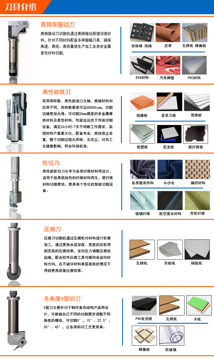 適用行業(yè):珍珠棉、EVA、海綿、KT板、不干膠、蜂巢板、瓦楞紙材料的切割等